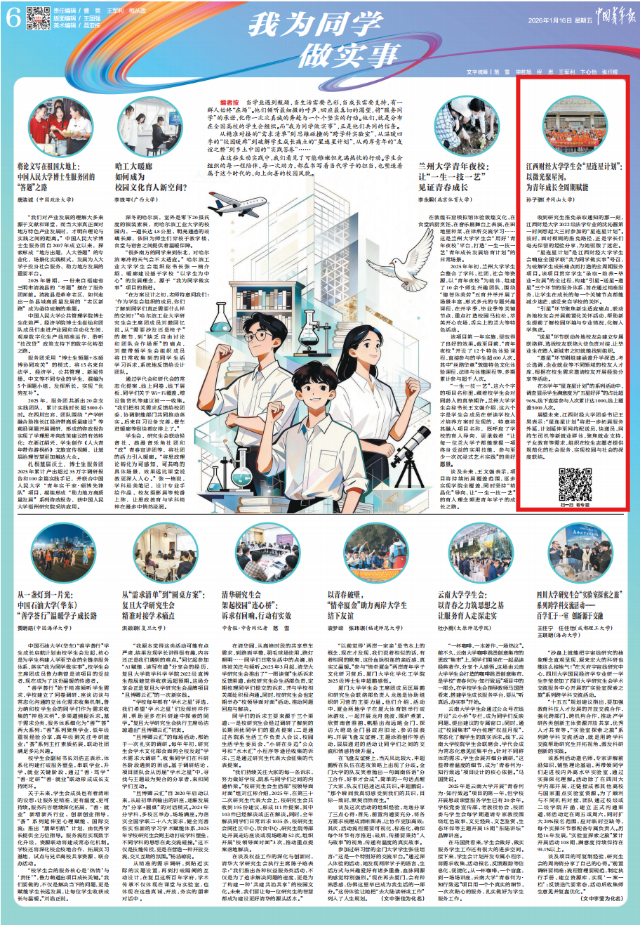 近日,由全国学联秘书处联合中国青年报、中青校媒发起的全国高校学生会组织“我为同学做实事”启航季服务项目网络巡展活动结果公布。《中国青年报》(2026-01-1606版)以“江西财经大学‘星连星计划’:以微光聚星河,为青年成长全周期赋能”为题对我校学生会联合校团委、党委组织部、招生就业处及校友联络服务中心于2024年6月启动的“星连星计划”进行报道,相关内容同步刊发于报纸纸刊与官方客户端。该报道聚焦我校服务青年学生成长的具体实践,展现了我校服务育人工作的理念与行动。