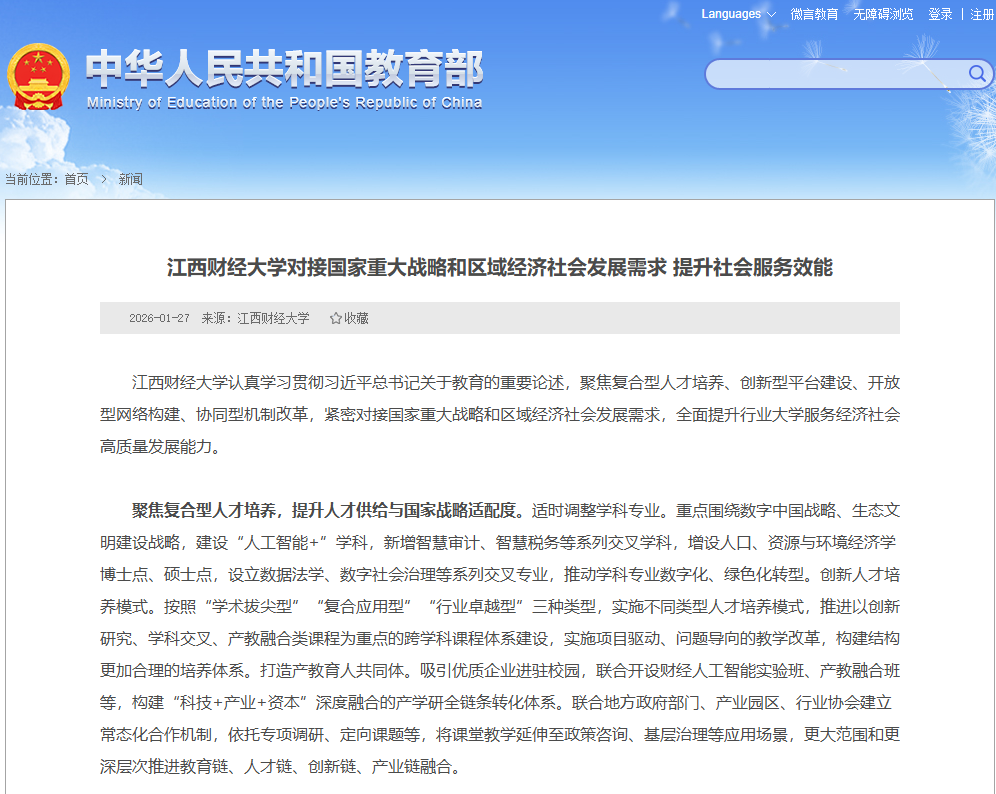 报道指出,江西财经大学认真学习贯彻习近平总书记关于教育的重要论述,聚焦复合型人才培养、创新型平台建设、开放型网络构建、协同型机制改革,紧密对接国家重大战略和区域经济社会发展需求,全面提升行业大学服务经济社会高质量发展能力。