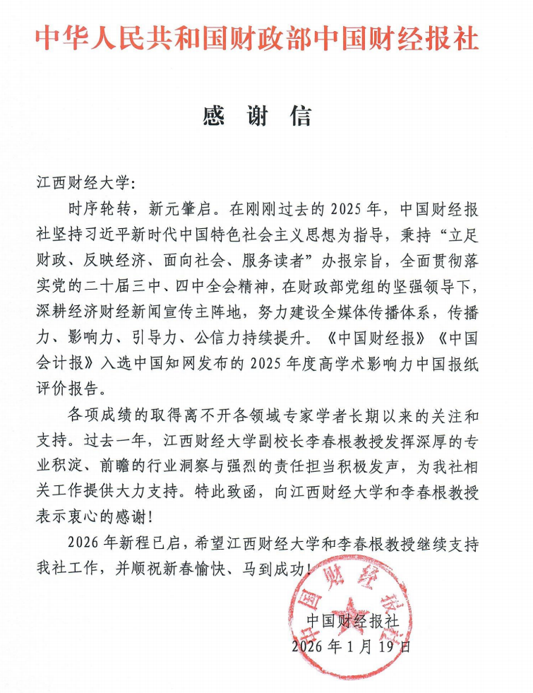 信中指出,在刚刚过去的2025年,中国财经报社各项成绩的取得离不开各领域专家学者长期以来的关注和支持。过去一年,江西财经大学副校长李春根教授发挥深厚的专业积淀、前瞻的行业洞察与强烈的责任担当积极发声,为报社相关工作提供大力支持,特此向我校和李春根教授表示衷心的感谢。