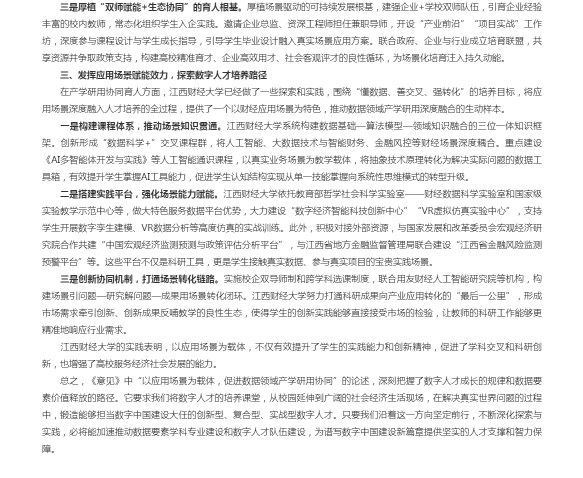文章围绕《关于加强数据要素学科专业建设和数字人才队伍建设的意见》,从三个方面展开论述:一是突出应用场景载体定位,应用场景是人才能力的校准仪、产教融合的接口、复合能力锻造的实践场;二是强化应用场景牵引作用,构建“需求融合+学科交叉”的培育体系、打造“全链场景+能力进阶”的培养平台、厚植“双师赋能+生态协同”的育人根基;三是发挥应用场景赋能效力,构建课程体系、推动场景知识贯通,搭建实践平台、强化场景能力赋能,创新协同机制,打通场景转化链路。