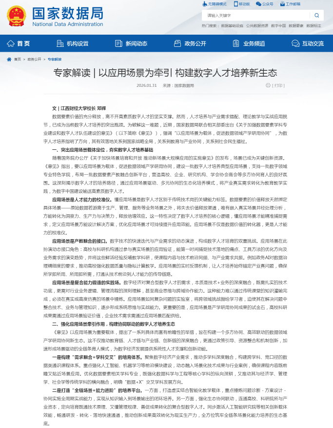 近日,国家数据局“专家解读”栏目刊载校长邓辉教授解读文章《以应用场景为牵引 构建数字人才培养新生态》。