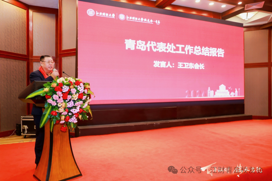 青岛代表处第四届理事会会长王卫东作工作报告。他用扎实的数据与鲜活的案例,回顾了过去多年在校友联络、校企合作对接、校友论坛、平台搭建等方面的亮眼成效,系统梳理了校友会为凝聚校友力量、服务校友发展所做的努力与积累,为换届交接筑牢坚实基础。王卫东表示,青岛校友会的发展离不开全体校友的同心协力与无私奉献,如今将这份责任交接出去,满心都是期待与祝福,“相信在纪东会长的带领下,青岛代表处一定会焕发更蓬勃的生机,愿大家永远铭记‘信敏廉毅’校训,永葆江财人的赤子之心”。