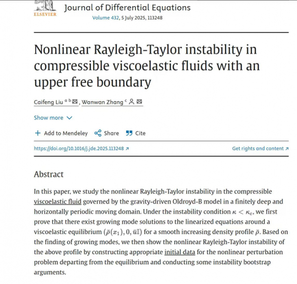 近日,信息管理与数学学院数学与计算科学系刘彩凤博士在国际高水平综合类数学期刊《Journal of DifferentialEquations》上发表题为“Nonlinear Rayleigh-Taylor instability in compressible viscoelastic fluids with an upper freeboundary”的论文。《Journal of DifferentialEquations》是国际公认的微分方程方向高水平期刊,由Elsevier出版,旨在刊登“微分方程理论及其应用前沿的高质量研究成果”。刘彩凤博士为该论文的第一作者,江西财经大学为第一单位。