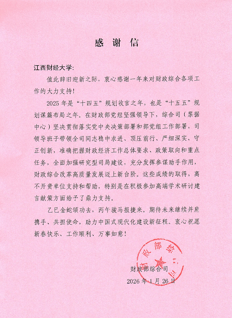 信中指出,2025年作为“十四五”规划收官和“十五五”规划谋篇布局的关键之年,财政部综合司在政策研究与改革推进中取得显著成效。其中,学校通过积极参与高端学术研讨、建言献策,为财政综合改革提供了坚实智力支持。这充分体现了部省共建背景下,学校在政策分析领域的扎实积累与前瞻视野。