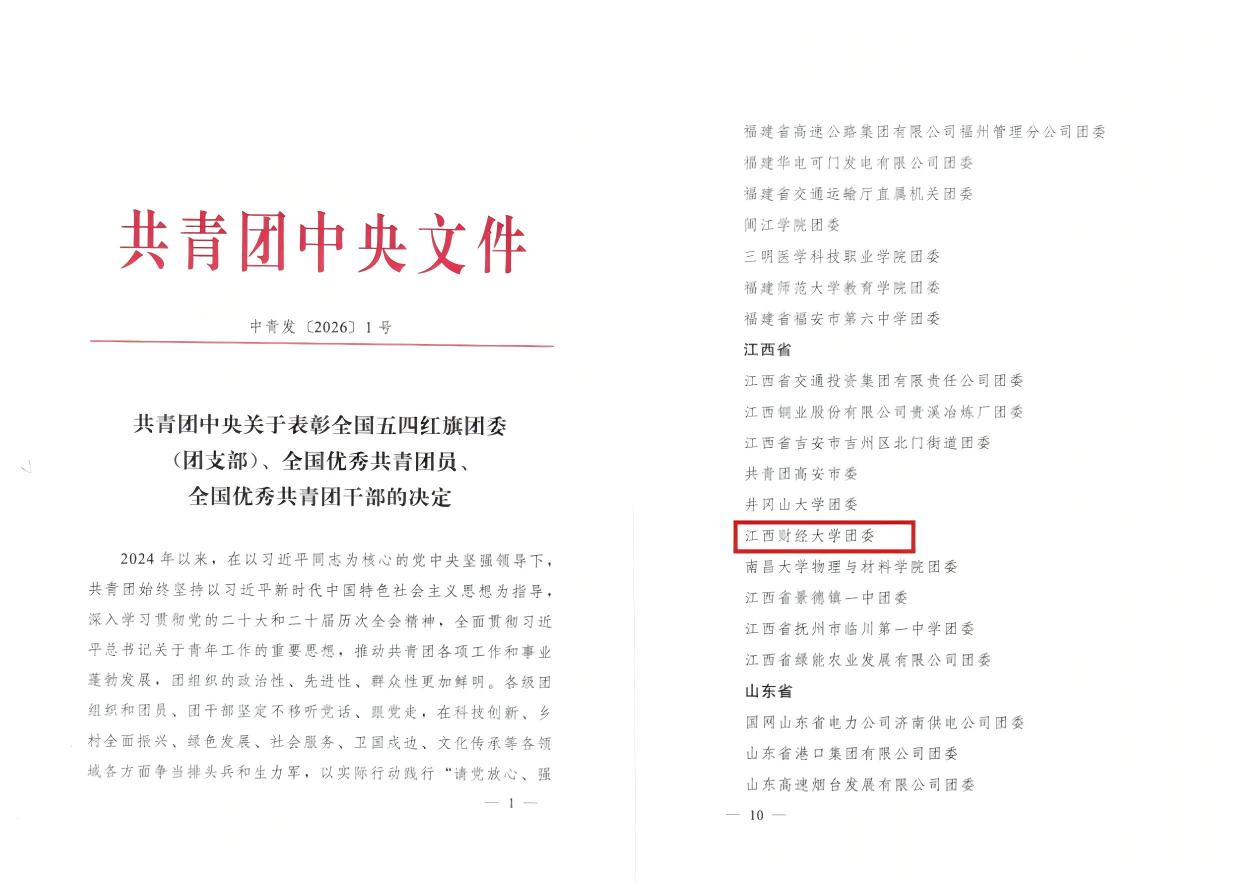 近日,共青团中央下发《共青团中央关于表彰全国五四红旗团委(团支部)、全国优秀共青团员、全国优秀共青团干部的决定》,江西财经大学团委获评2025年“全国五四红旗团委”,斩获共青团系统全国性最高集体荣誉,这是对学校共青团工作的高度认可与肯定。