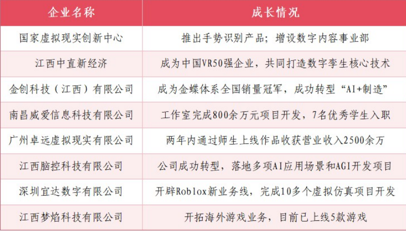 攻关新技术新产品,推动企业转型和产业升级:助力国家虚拟现实创新中心落户南昌,7家合作企业跻身“中国VR50强”;助力8家驻校企业在营收增长、业务拓展和技术产品创新等方面实现高质量发展,产生经济效益超1.2亿元。