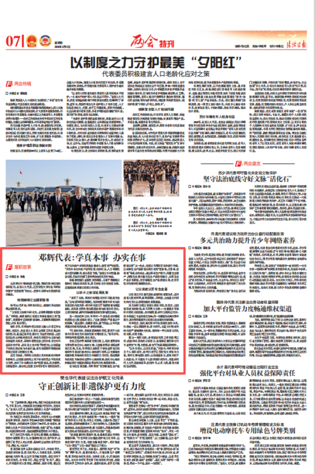 3月12日,《法治日报》07版“两会特刊”栏目以“邓辉代表:学真本事办实在事”为题,报道了全国人大代表、江西财经大学校长邓辉的履职事迹。