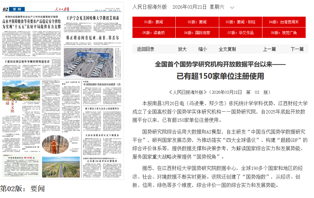 3月21日,《人民日报海外版》02版报道全国首个国势学研究机构开放数据平台以来——已有超150家单位注册使用。