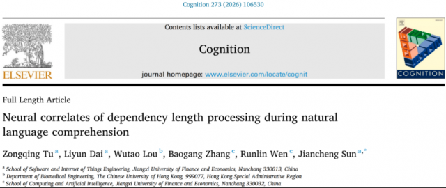 近日,软件与物联网工程学院在自然语言理解与认知神经科学交叉领域取得新进展,相关成果《Neural correlates of dependency length processing during natural languagecomprehension》发表于认知科学领域重要国际期刊《Cognition》(学校A类刊物)。该论文第一作者为硕士生涂宗晴,香港中文大学娄武涛博士参与合作,软件学院孙建成教授为通讯作者。