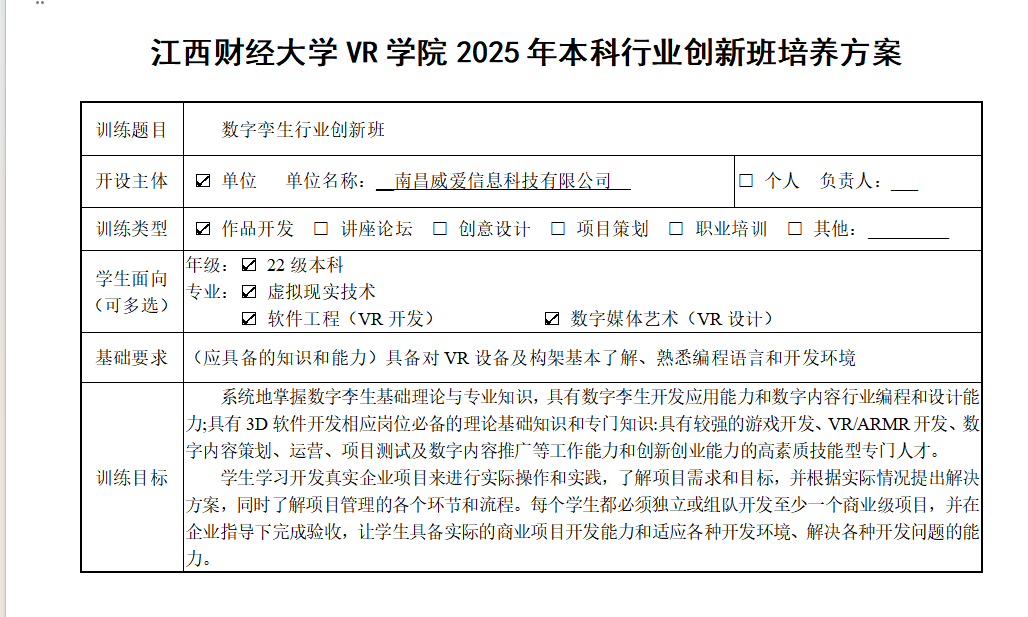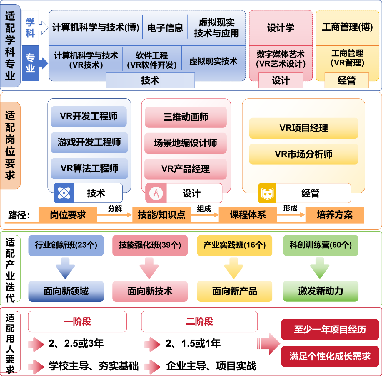 紧扣VR产业技术迭代快、新领域新赛道不断涌现的特点,以产业新领域、新技术、新产品为导向,创新开设多元化产教融合班型,实现人才培养与产业迭代的同频共振,解决人才培养滞后于产业技术发展的问题。