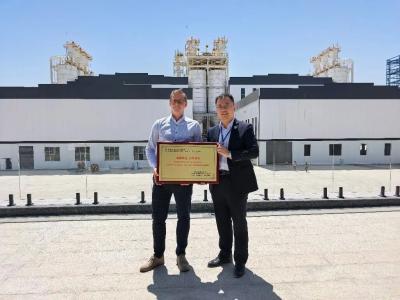 温鹏董事长在乌兹别克斯坦项目竣工仪式上接受业主方颁发的荣誉奖牌