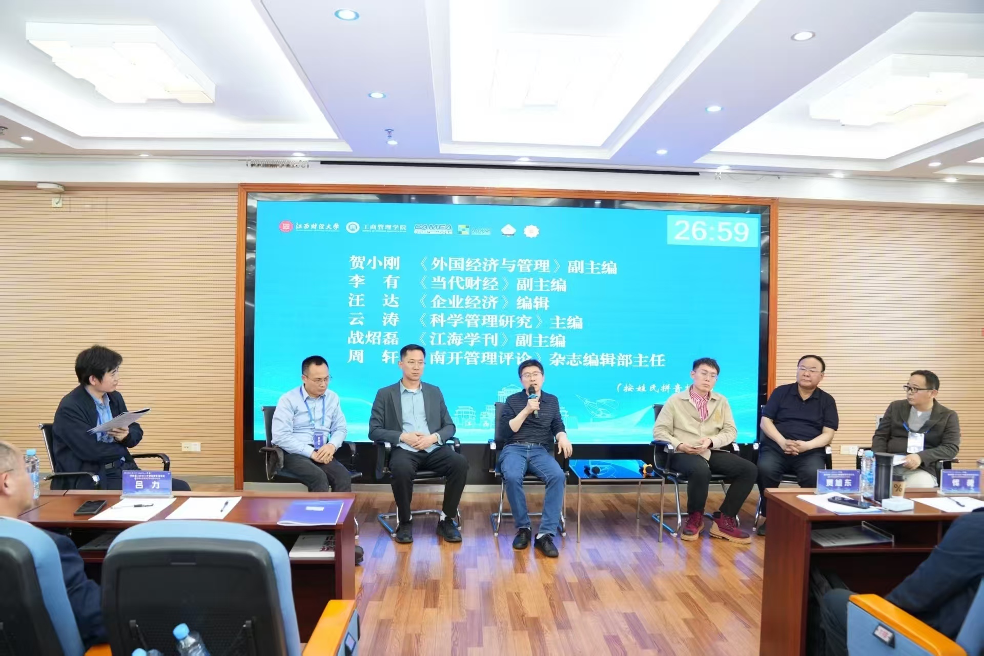 期刊圆桌对话环节,《科学管理研究》主编云涛、《外国经济与管理》副主编贺小刚、《当代财经》副主编李有、《江海学刊》副主编战炤磊、《南开管理评论》编辑部主任周轩、《管理学报》编辑部主任丁秀好、《企业经济》编辑汪达等围绕中国自主知识体系构建中的期刊责任,共同探讨了专栏设置、选题论证、范式创新与洞见优先等相关发表事宜。