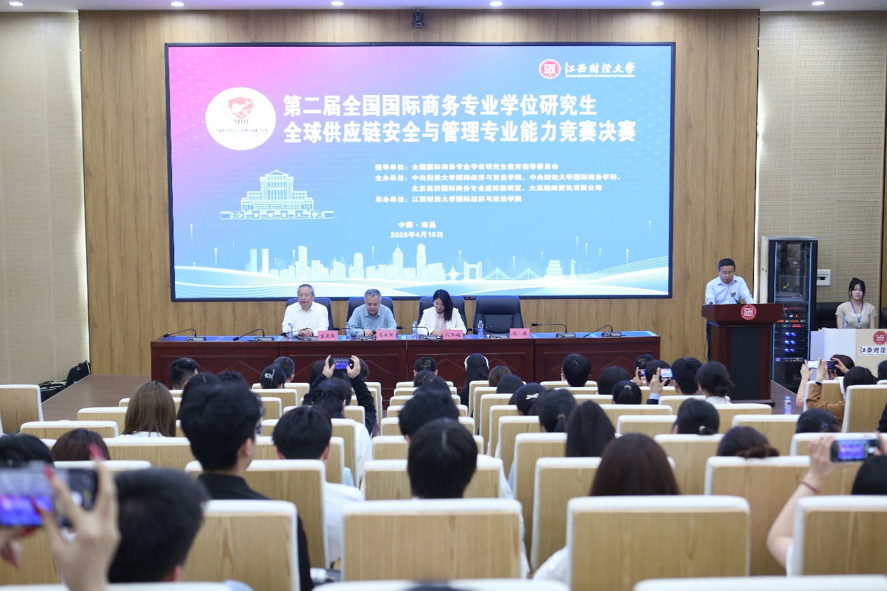 4月18日,第二届全国国际商务专业学位研究生全球供应链安全与管理专业能力竞赛决赛在我校举行。本届赛事由全国国际商务专业学位研究生教育指导委员会指导,中央财经大学国际经济与贸易学院、中央财经大学国际商务学科、北京高校国际商务专业虚拟教研室、大连瀚闻资讯有限公司联合主办,江西财经大学国际经济与政治学院承办。