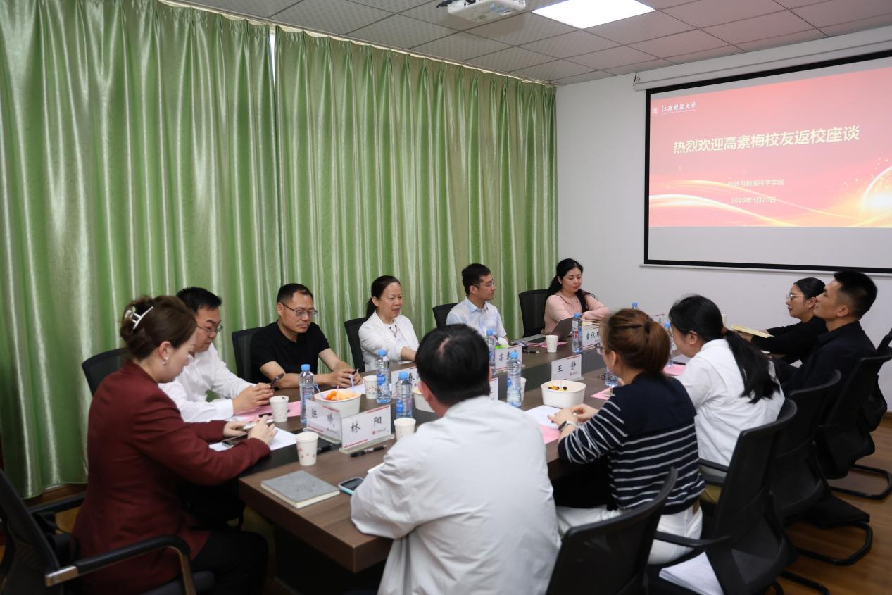 4月20日下午,北京中视东升文化传媒有限公司总裁高素梅校友来到统计与数据科学学院,与师生代表亲切座谈交流,江西融合科技有限责任公司董事长童伙球、校友联络服务中心、统计与数据科学学院、应用统计研究中心、国势研究院相关负责人以及青年教师代表参加座谈。