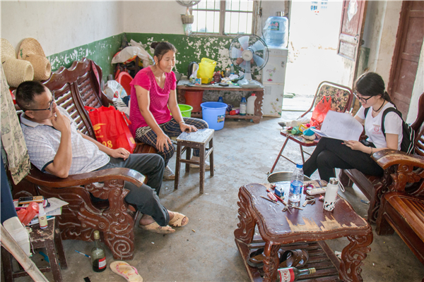正值三伏天,也逐渐到了农忙时节,白天农户大多出门务农,调研队一大早就随当地干部到了农户家,由于贫困户中大多年老体弱,文化程度低,甚至有听觉障碍,再加上队员们不懂方言,给调研工作遇到了不小的阻碍。“我听不清”、“我不记得”、“我不懂”……这些都是队员们常听到的答复。队员们便用自己的话语将问卷转化成通俗易懂的家常问题,并借助随行干部做翻译,努力把问题说得简单一点。