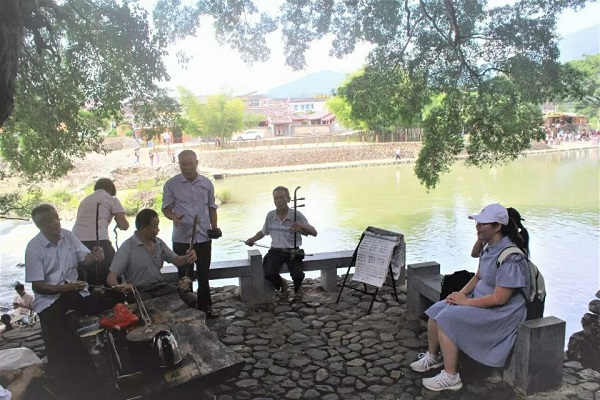 在南靖云水谣古镇的百年古榕树下,有着这么一群二胡艺人。演奏者都是60岁以上的老人。这些二胡演奏者在2008年土楼申请世界遗产成功后被政府召集起来,演奏民间音乐,弘扬客家文化,距今已有9年。