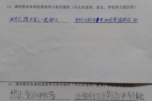 修水县是一个贫困县,山区众多,大部分农村青壮年都外出务工,因此留守儿童众多,由此产生的各种问题也很突出。调研组先后来到渣津镇朴田村、黄沙镇汤桥村、宁州镇东村以及良瑞移民新村等地的小学进行实地考察,对当地的学生以及老师进行了关于英语学习与教学方面的访问,并在教室与学生们一起听课,亲身感受到乡村小学的教学硬件、教师的教学能力以及学生们的课堂表现。最后,课题组成员们在各个学校均发放了调查问卷,为课题调研有更加具体的数据体现,学生们也用稚嫩的笔触写下了对未来的期待。