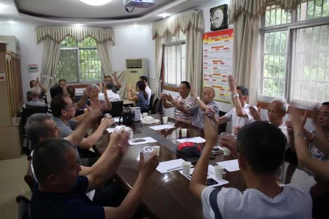 第二场活动在九江军休一所会议室召开,本场活动共有17人参加,军休干部的热情不减。出席本场活动的年龄最大的已经96岁,很多80岁以上的老人也在活动中找到了新的健身方法;通过集体感受音乐催眠和杯子歌红歌演唱,使得军休干部的注意力和手脚协调能力大大提高;同时活动的成功也赢得了军休所领导的一致赞赏。