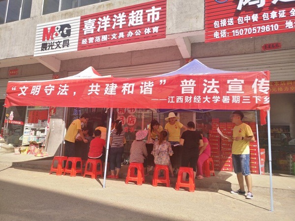 法律是社会发展进步的保障,只有强化了人们的法治意识,才能够真正确保农村经济、政治、文化、社会及生态的平稳运行。7月17日,我校暑期三下乡一团丰城同田村长助理团开展了以“文明守法,共建和谐”为主题的特色社会实践活动,为同田村播撒法治的种子。