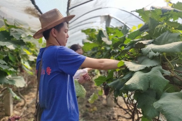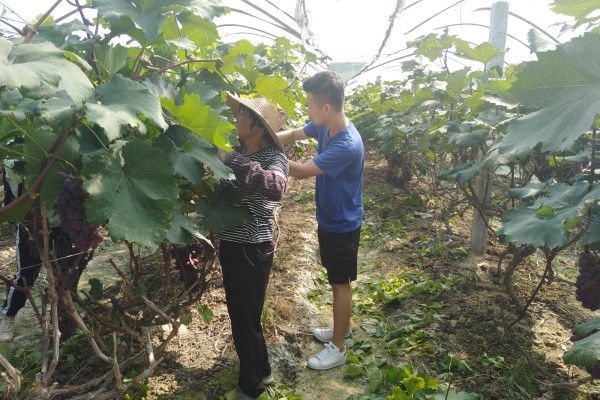 22日上午,村长助理团成员来到盛平果业专业合作社,合作社负责人胡小微热情的接待了大家,并向大家介绍了合作社的大致情况。合作社于2013年注册,由当地部分村民自愿联合成立,合作生产、合作经营,经营范围包括果树种植、果品零售兼批发等。近两年,为响应国家保护生态环境的号召、支援美丽乡村的建设,合作社在当地政府的帮助下,已经建立生态果园场,探索环境污染更低、经济效益更高的生产方式。接着,助理团成员们跟着果园负责人来到葡萄园,对园内种植生产情况进行考察。果园内葡萄长势喜人,外形美观,果实饱满,如同串串玛瑙挂在绿野之间,已经成为当地一道亮丽的风景线。负责人告诉来访的成员们,合作社采取“公司+农户”的经营模式,努力发展成为特色水果种植、加工、销售、贮藏为一体的新型农业合作组织。在现在的葡萄种植过程中,大棚种植改善葡萄品质;科学施肥,重施有机肥,大力推广使用农家肥,大大减少了农药的施放。被问及葡萄园产品销售情况,负责人告诉大家,现在葡萄园产出的葡萄主要供应周围乡镇,可为参与合作社的村民带来一笔数量相当的收入;此外,“互联网+”销售模式发展也已经提上日程。而后,成员们跟随果农们,参与葡萄植桠的修剪工作。果农们告诉大家,平时的管护修剪植桠很重要,能够有效提升葡萄的口感。顶着烈日,大家拿起剪刀,按照果农的指导剪下枯弱的枝丫。“我们只修剪了一小时就已经觉得很累了,果农们长期工作有多么辛苦可想而知。”还有不少团员表示,真正走进葡萄园、看见果园的运作、了解每一步流程之后,才明白一些政策的推行和科技的引进难度有多大。