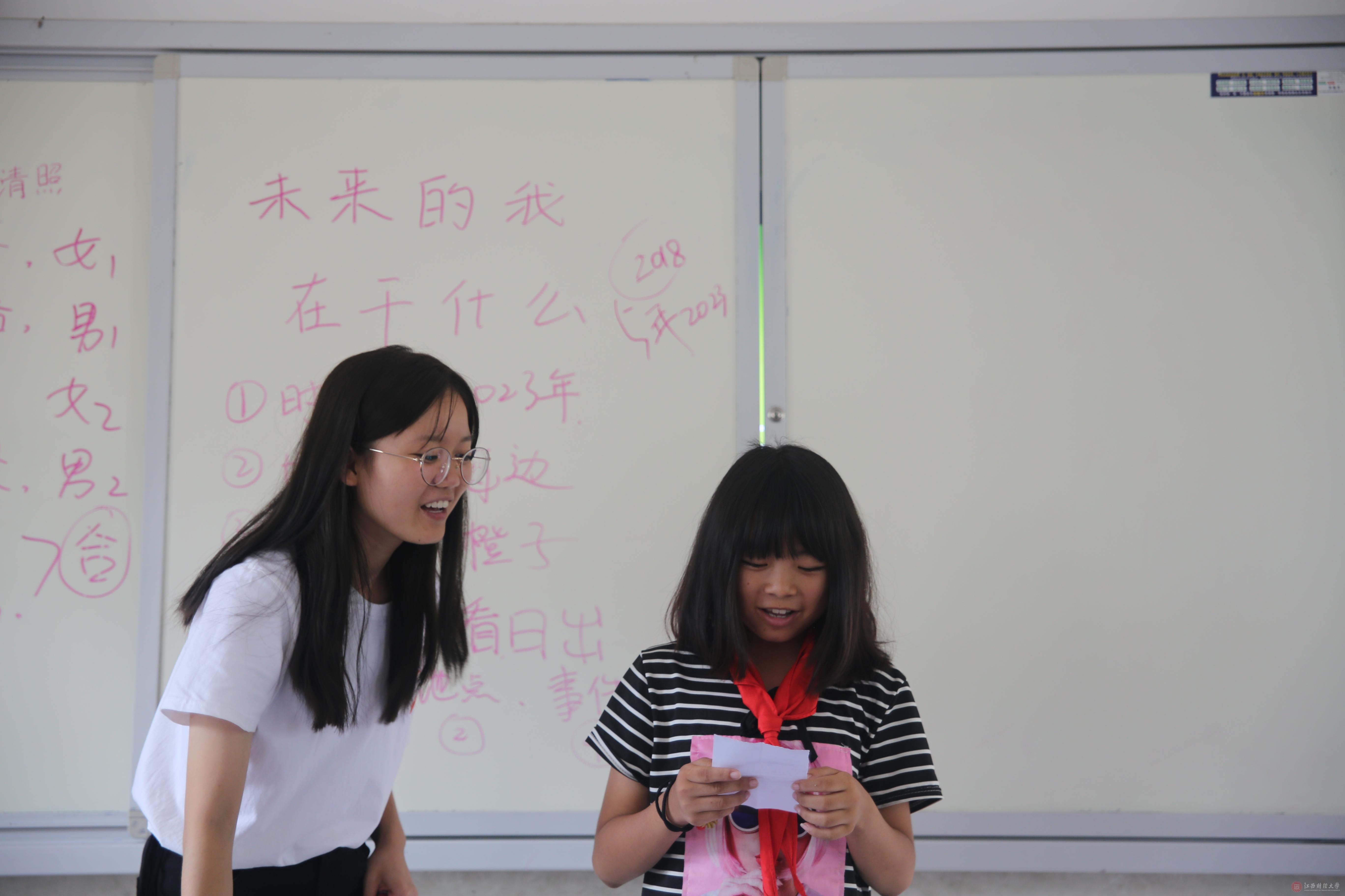 “常记溪亭日暮,沉醉不知归路。”志愿者运用歌唱的形式带领孩子们学习古诗词《如梦令》与《西江月》,在轻松愉快的氛围中开启晨读,唤醒孩子们的头脑。短暂休息过后,志愿者组织孩子们进行了一个名为“未来的你在做什么?”的游戏,旨在告诉孩子们未来并不一定会按照自己所料想的那样发展,而是要做好迎接意外的准备。接下来志愿者带领孩子们写下一封给未来的自己的信,意在引导孩子们树立理想意识,为将来孩子们的发展奠定基础。此外,志愿者对孩子们谆谆教诲,使孩子们认识到梦想并不只是纸上谈兵那样简单,而要坚持不懈。之后,通过“你划我猜”的游戏引导孩子们对当今社会的部分职业有初步的认识,由此为孩子们提供部分的职业参照,树立孩子们正确的职业观。