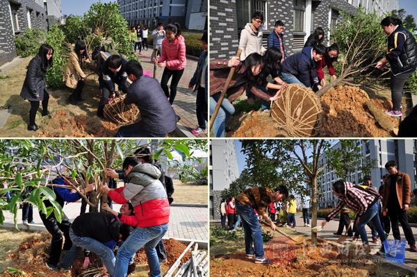 仪式后,校领导及各部门负责人同学生代表一起栽种了包括桃树、李树、茶树在内的十余颗树木,为校友林种下了第一片寄情之林。