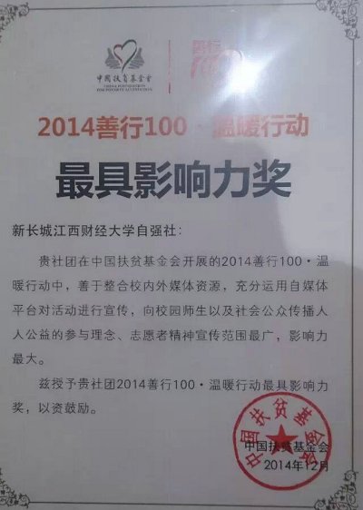 在去年冬天的爱心包裹劝募活动中,自强社累计组织640余名志愿者,在南昌13个网点开展活动。为期7周(11月1日—12月14日)的劝募活动共募得美术包991个,温暖包342个,一共帮助了1333名贫困地区小学生。活动引起省内外媒体的广泛关注,《江南都市报》、江西五套等主流媒体对活动进行跟踪报道,相关新闻被数十家国内媒体转载,产生了良好的社会影响。为此,我校自强社被中国扶贫基金会授予2014“善行100•温暖行动”最具影响力奖,并获评全国优秀自强社。