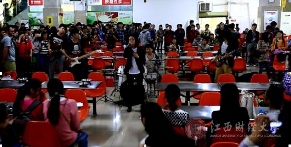 中午12:00,正是江西财经大学鼎食轩食堂用餐的高峰,食堂一楼大厅熙熙攘攘,突然响起一阵动感的鼓声,随后从用餐的人群中站起几位手持吉他、贝斯的乐手加入了演奏;最后走出了一名美国留学生和一名女生,手持麦克风为大家来了一场《国际歌》+《江西财经大学校歌》+《改变自己》的歌曲大串烧。他们整场高歌,引得在食堂用餐的人们纷纷起身围过来观看,高潮处也不乏有人情不自禁跟着齐唱。