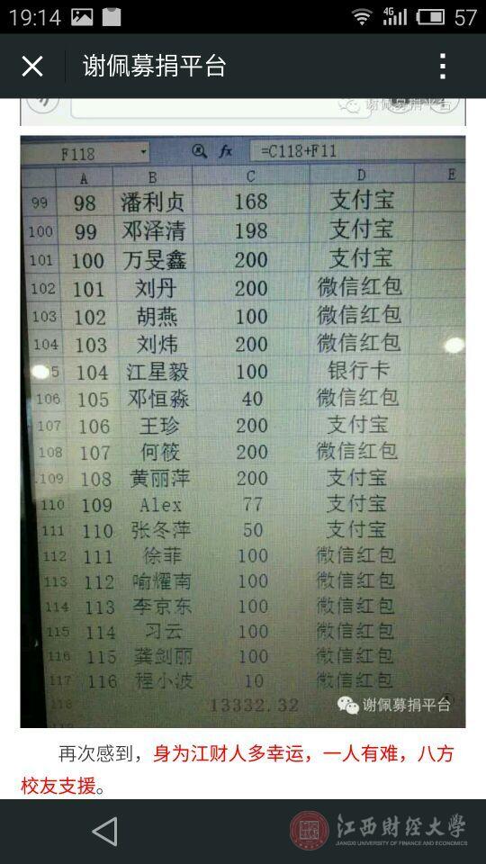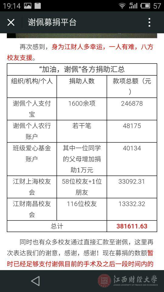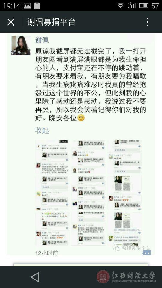 谢佩是我校2010级市场营销2班的校友,在毕业前夕被诊出结肠癌中晚期。今年4月11日,第二次手术失败后的谢佩因担心时日无多,第一次在微信朋友圈中公开了自己的病情,随即引起她的58位同班同学和其他众多江财校友的关注。大家纷纷伸出援助之手,短短几天,来自于各地校友的善款通过支付宝、微信红包、银行账户、班级爱心基金账户等迅速汇集。为此,2010级市营2班的同学专门开通了“谢佩募捐平台”微信号,对募捐款项进行公示,并及时播报谢佩病情。但当谢佩想要知道帮助她的校友的名字时,他们却只是说“不用了,你好好加油,我们都是江财人,大家等你康复。”