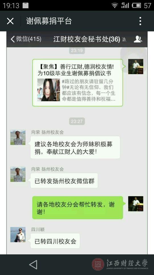“截止14号10点30分……募捐款项总计38.16万元,其余各地校友正在积极募捐,并统计名单。”——这是今天来自于“谢佩募捐平台”微信号的内容。近日,一则“善行江财,德润校友情!为10级毕业生谢佩募捐倡议书”迅速在各地校友会QQ群、微信群转发,一张借助社交媒体织就的爱心网络不但给病痛中的校友送去关爱,也见证了江财人互助互爱的可贵品质。