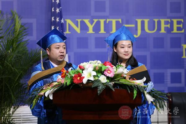 学生代表孙璐璐、李鹏启上台发言,表达了对江西财经大学和纽约理工学院的感谢。并表示将运用自己所学到的知识在各岗位上锐意进取,奋力拼搏,报答母校,回馈社会。