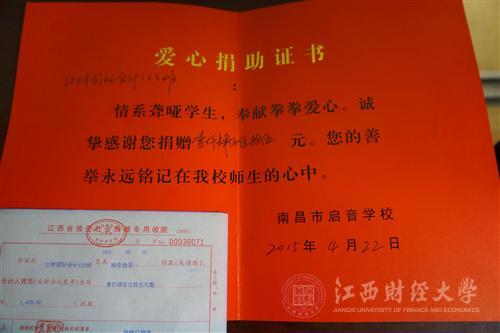 2015年4月12日,该院青年志愿者协会带着全院同学的善款,再次来到了南昌市三联特殊教育学校。和校长进行了简单的沟通并说明了来意。当志愿者们把善款交到他们手中时,校长与老师们用手语向志愿者们的辛勤付出表达了谢意,他们用无声的语言、他们眼中的的真诚朴实深深地打动了志愿者们。
