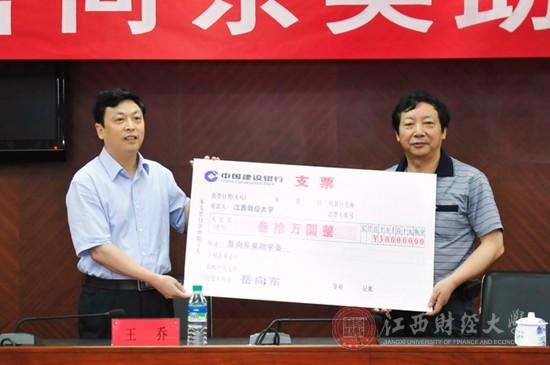 2012年6月18日下午,岳向东校友感恩母校奖助学金捐赠仪式在蛟桥园南区综合楼举行,王乔校长代表学校接受岳向东校友的捐赠。岳向东校友是我校84届基信专业毕业生,现任江西省投资有限公司董事长。多年来,他始终心系母校,积极为学校的发展建设提供支持和帮助,关心母校的发展进步,关怀学子的成长成才。为了帮助出身贫寒、学习刻苦的学子顺利完成学业,实现人生理想,岳向东校友于2010年11月16日正式设立“岳向东奖助学金”,每年提供10万元奖学金奖励50名家庭经济贫困的在校优秀学生,至今已奖励三届,惠及全校各专业150名学生,使他们的求学之路少了一些后顾之忧,使他们的心里多了一份温暖感动。在母校90周年华诞即将来临之际,岳向东校友再次向母校捐赠30万元,用于奖励成绩优异,能力突出的优秀学子。