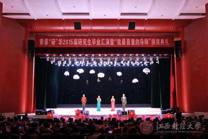 回首昨日,超越梦想,青春激扬;展望今朝,波澜壮阔,无限荣光。6月15日晚7点,青春“研”华江西财经大学2015届研究生毕业汇演暨第四届“我最喜爱的导师”颁奖典礼在蛟桥园大礼堂隆重举行。校党委副书记易小明,副校长王小平,校长助理阙善栋、李良智出席并观看演出。学校各职能部门领导,各研究生培养单位领导,以及第四届“我最喜爱的导师”荣誉称号获得者参加了本场晚会。