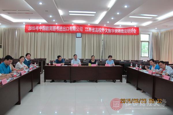 6月25日上午,2015年中国教育图书进出口公司暨江西省高校外文数字资源建设研讨会在我校举行。此次会议由中国教育图书进出口有限公司主办,江西财经大学图书馆承办,湖南大学、华中科技大学、国防科技大学等兄弟省份高校以及南昌大学等省内兄弟省份高校图书馆馆长应邀参会。会议由中国教育图书进出口公司经理潘雪峰主持,我校图书馆馆长蒋岩波致辞。