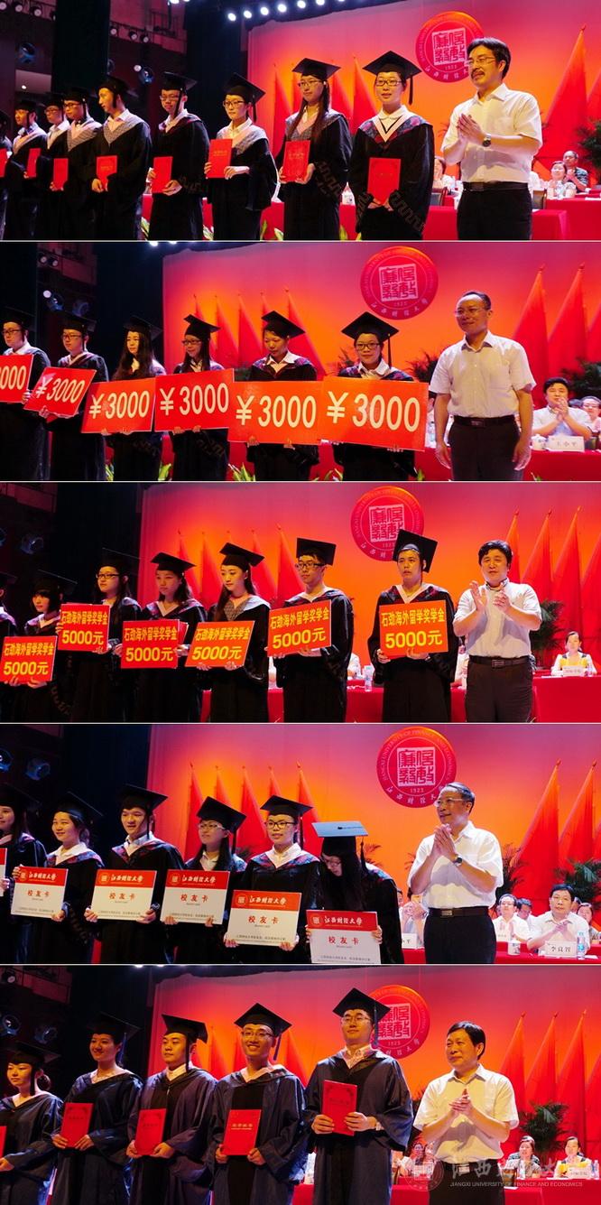 接下来,工作人员宣读了准予2015届毕业生毕业和授予学位的文件,宣读了对优秀毕业生的表彰决定。蒋金法、杨建林、王小平、李良智分别为获得毕业生先进个人、石劲海外留学奖学金、优秀本科毕业论文(设计)的师生颁发了奖状和奖金。阙善栋为毕业生代表赠授了校友卡。