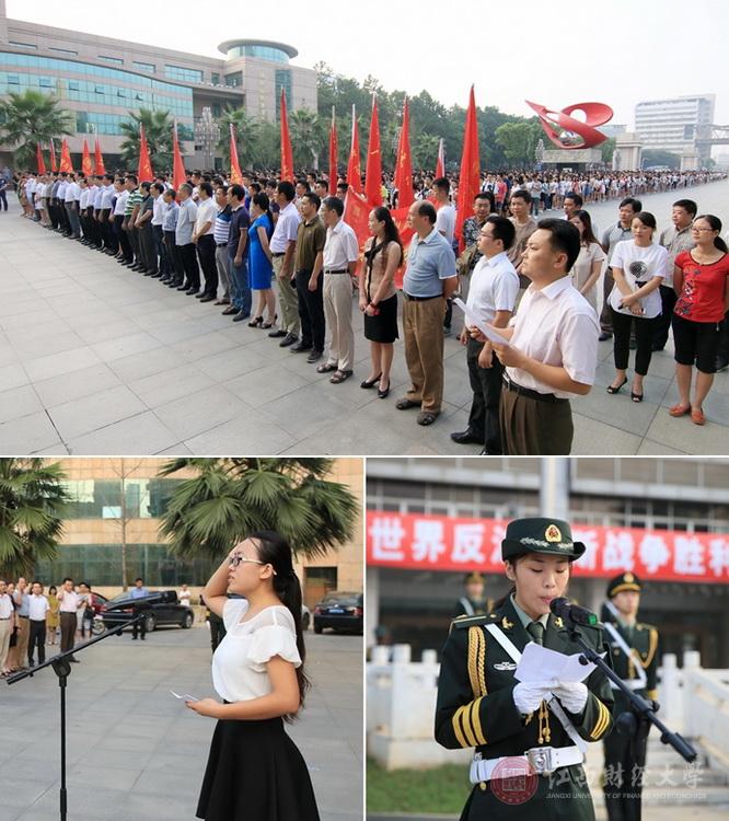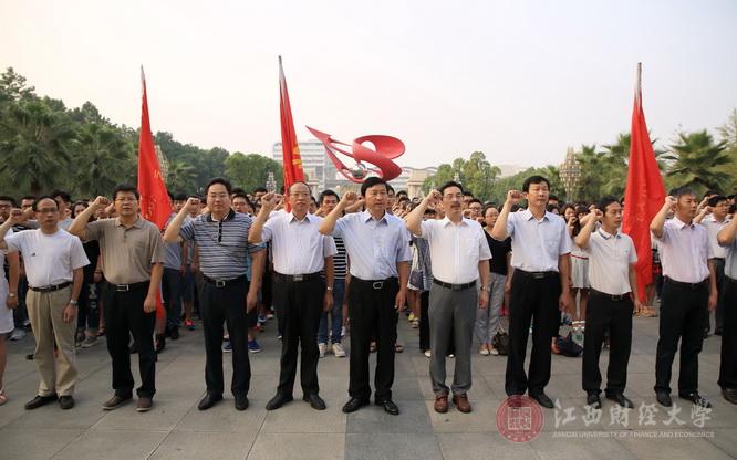 在省学生联合会驻会主席、我校信息管理学院王文静同学的带领下,参加升旗仪式的师生在国旗下庄严宣誓,表示将永远铭记惨遭帝国主义侵略的历史,深切缅怀革命先烈,珍惜和平环境和幸福生活,发奋学习、立志报国,为实现“两个一百年”奋斗目标、实现中华民族伟大复兴的中国梦而奋斗。