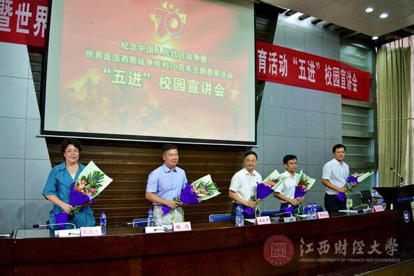 根据中央和省委有关开展中国人民抗日战争暨世界反法西斯战争胜利70周年纪念活动的部署,9月8日下午,省委教育工委、省教育厅、省委党史研究室、共青团江西省委、江西省中国和平统一促进会联合开展的以爱国主义为核心的民族精神教育、社会主义核心价值观教育、党史和红色文化教育、法治教育、创新创业教育“五进”校园宣讲会走进我校。省教育厅巡视员周金堂主持,我校党委副书记易小明出席。