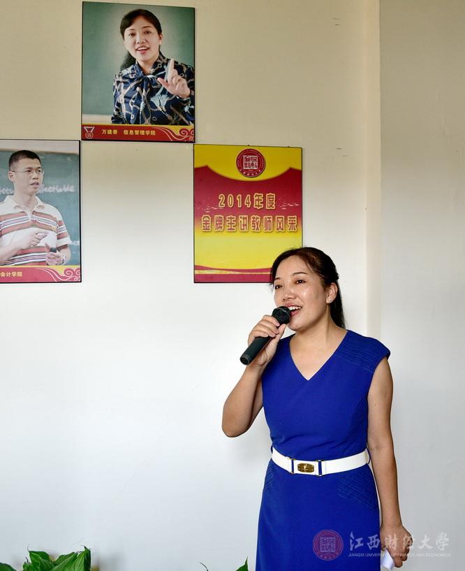 2014年度金牌教师代表、信息学院副院长万建香在仪式上发言。她用感谢,自豪,行动三个词来表达此刻的心情。感谢学校、领导、各位老师和同学对本人的关心和厚爱,感谢教务处为教师提供的优质服务,有了金牌教师这个平台,我们对教学有更远、更大的遐想空间。感谢宣传部所做的宣传和分享交流。她将以满腔的热情化作实际的行动,教书育人,敬业乐群,一起为“百年名校”江财梦奋斗。同时祝愿全校教职工节日快乐。
