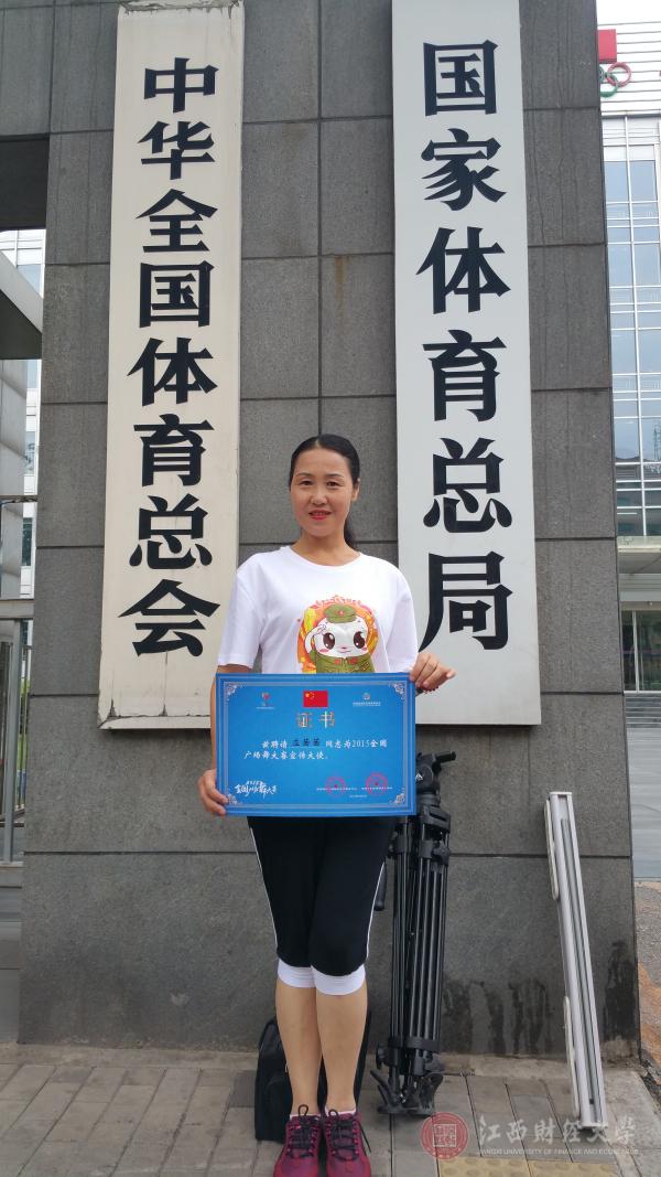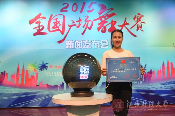 为贯彻落实文化部、体育总局、民政部、住房城乡建设部联合印发的《关于引导广场舞活动健康开展的通知》精神,促进我国文化建设与群众体育协调发展,给广场舞爱好者提供一个交流展示的平台,更好地引导、扶持、推动全国广场舞运动健康有序发展,由国家体育总局等单位联合主办的2015年全国广场舞大赛于9月至10月在全国展开。本次大赛于9月9日在北京正式启动,在新闻发布会上,我校教工应茜茜被宣布出任2015年全国广场舞大赛宣传大使。