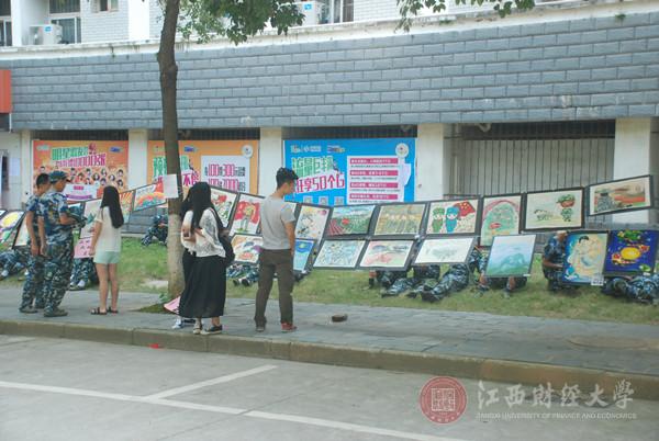 此次作品主题主要以中秋和军训为主题,是从艺术学院2015新生中收集的优秀作品。作品集思想性、艺术性、观赏性于一体,导向正确,各具特色,具有较高的品味,不乏精品力作。在展出过程中,随时可以看见同学们驻足欣赏的身影以及热切的讨论声,还有不少同学在自己喜爱的画前拍照留念。在结束一个上午辛苦的军训后,此次书画展不仅是给艺术学院的学生带来亲切感,更是让从蛟桥校区和枫林校区前来参加军训汇演的同学们在中秋佳节来临与军训结束之际留下了一种特殊的回忆。