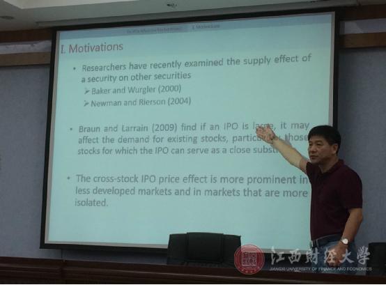 10月26日上午,复旦大学管理学院财务金融系主任孙谦教授应邀在我校金融管理国际研究报告厅作了题为“Do IPOs Affect the Market Price? —Evidence from China”的学术报告。报告会由金融管理国际研究院副院长严武教授主持。相关专业的教师、博士及硕士研究生参加了此次报告会。