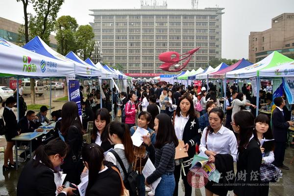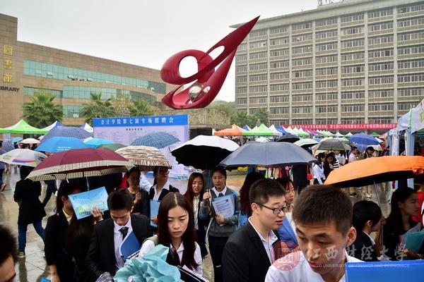 上午9时,崛起广场,人头攒动、企业云集。应届毕业生们手持简历不断穿梭在企业间,仔细浏览各企业简介海报,结合自己的专业选择合适的岗位,依次进入简历的投递、面试、问答等环节。虽然当天下着大雨,但是应届毕业生们求职的热情依然不减。除了我校学子外,更不乏大批外校求职者前来应聘,整个招聘会现场人山人海,各项工作有条不紊地进行。