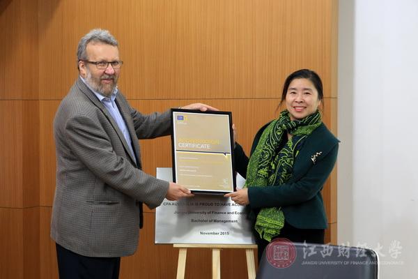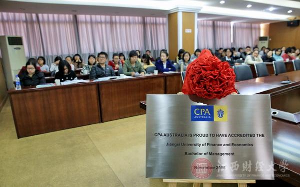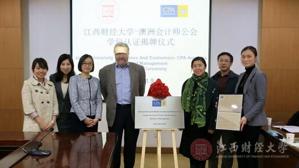 11月9日,江西财经大学与澳洲会计师公会(CPA Australia)学位认证揭牌仪式举行。国际学院院长杨慧与澳洲会计师公会课程认证高级顾问Ron Woolley共同为学位认证仪式揭牌。澳洲会计师公会上海办事处高级业务拓展经理龚浩莹、业务拓展主任钱茵、国际学院副院长陈卫东、副院长李庆以及学院师生参加了揭牌仪式。这是继今年1月获得美国CFA协会认证之后,我校再次成为第一家获得澳洲会计师公会认证的省内高校。这一认证标志着我校国际会计方向的本科专业课程设置与教学质量获得了国际权威会计专业团体的高度认可,体现了我校国际化办学取得的成果。
