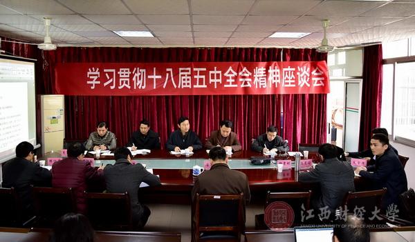 11月26日下午,由党委宣传部、马克思主义学院和中国特色社会主义理论体系研究中心共同承办的学习贯彻党的十八届五中全会精神座谈会在马克思主义学院举行。校党委副书记易小明出席座谈会并讲话。党委宣传部、组织部、学工部、马克思主义学院负责人和30余名师生参加座谈。