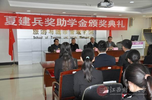 11月27日,“江西财经大学夏建兵奖助学金”颁奖仪式举行。校长助理阙善栋,校友夏建兵出席仪式。旅城学院、人文学院党政相关负责人以及获奖学生参加颁奖仪式。仪式由旅游与城市管理学院邹勇文院长主持。