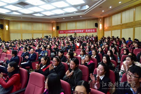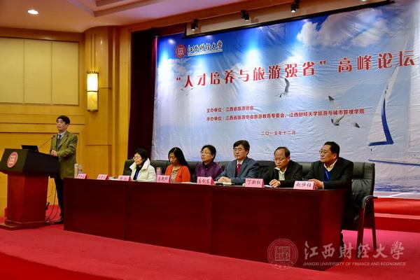 12月4日,由我校旅游与城市管理学院承办的2015人才培养与旅游强省高峰论坛暨江西省旅游协会旅游教育专委会年会在蛟桥园校区召开。江西省旅游发展委员会主任丁晓群、巡视员屈乾娜、副主任丁新权,中国旅游协会教育分会副会长徐虹,江西财经大学校长王乔、副校长易剑东,江西省旅游协会秘书长万恺出席,江西省旅游协会旅游教育专委会成员单位、旅游企业代表及学生代表400余人与会。会议分为上午的年会与下午的论坛两部分。