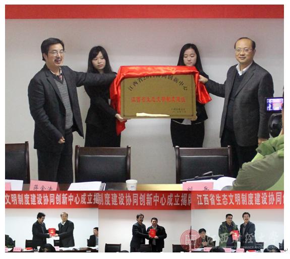 12月15日下午,江西省发展与改革委员会生态文明办刘兵主任和副校长蒋金法教授为我校江西省生态文明制度建设协同创新中心揭牌。江西农业大学MPA中心主任陈美球教授、江西省环境保护科学研究院副院长刘足根研究员、校生态文明与现代中国研究中心主任温锐教授、科研处匡小平处长、科技金融研究中心主任桂荷发教授、鄱阳湖生态经济研究院院长张利国教授、会计学院、统计学院、旅游与城市管理学院部分师生等应邀出席了会议。会议由协同中心主任谢花林教授主持。