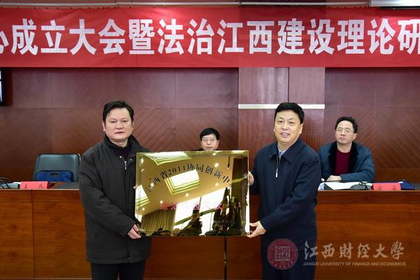 王乔在致辞时,希望协同创新中心集中力量深入研究法治江西建设中的重大理论和实践问题,以资源整合为重点,发挥优势、突出特色、服务大局,将协同创新中心建设成为 “法治江西建设”的知名智库。仪式开始时,王乔还亲自将 “法治江西建设协同创新中心”铭牌授予法治江西建设协同创新中心主任蒋悟真。