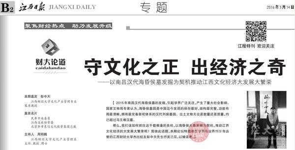 3月14日出版的《江西日报》B2版整版刊发了《守文化之正 出经济之奇——以南昌汉代海昏侯墓发掘为契机推动江西文化经济大发展大繁荣》一文。我校杰出校友、北京华章东信文化投资集团总裁彭中天做客《财大论道》,他建议以海昏侯大墓发掘为契机,推动江西文化经济的大发展大繁荣。本期《财大论道》由我校人文学院教授周明鹃主持。彭中天校友系民革中央委员、江西省政协常委。他是国内文化产业管理专业方面专家,目前受聘担任我校文化产业管理专业客座教授。